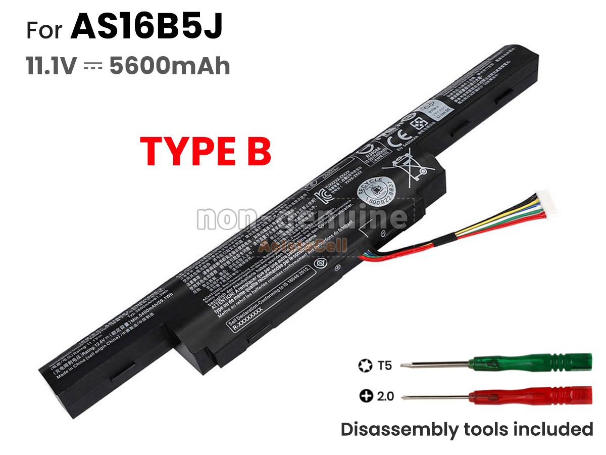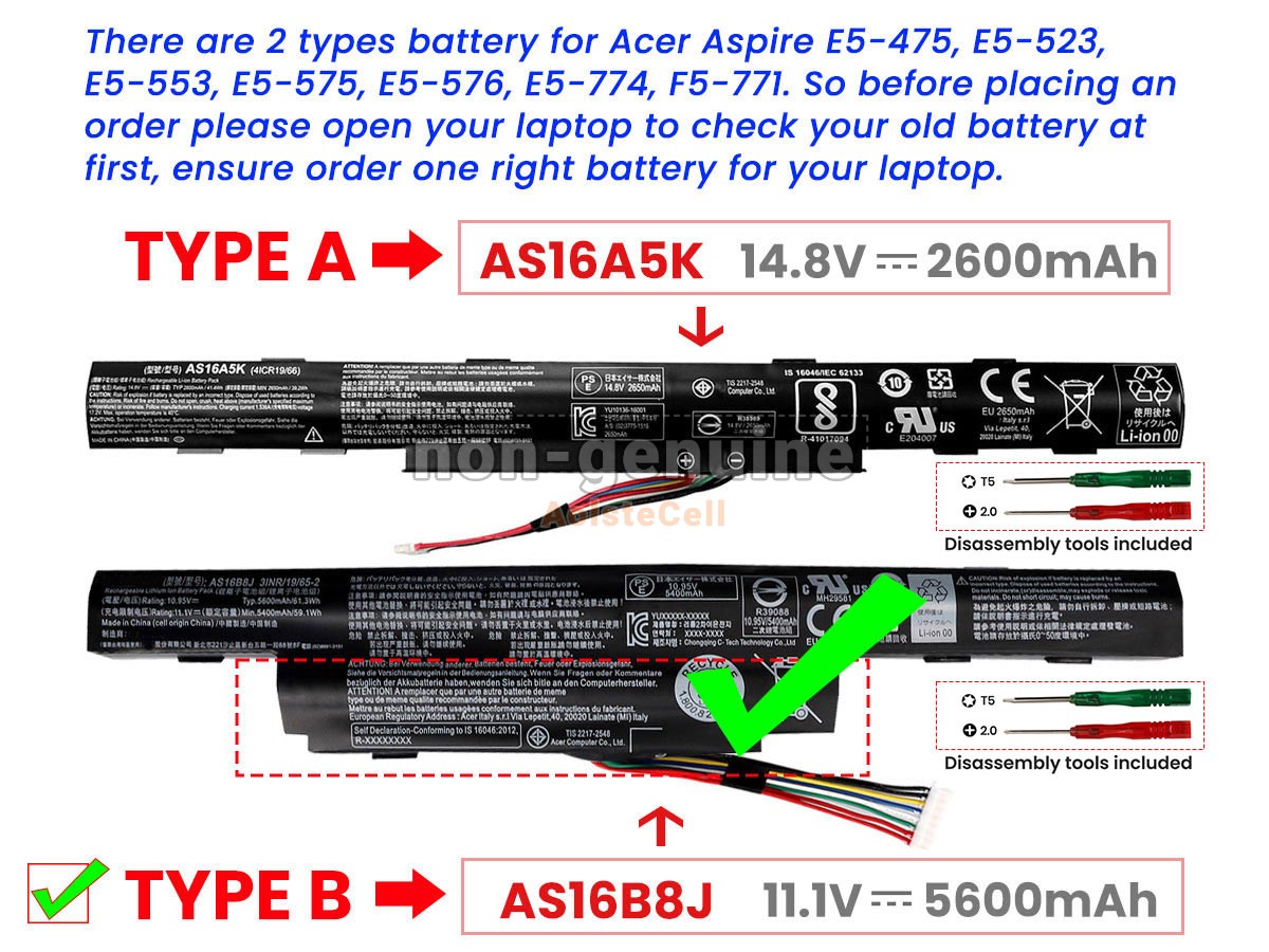 Product safety certification Before placing an order, please ensure your old battery's model is AS16A5K or AS16A8K (14.8V,2600mAh,4 cell) . If your old battery's model is AS16B5J or AS16B8J (10.8V,5600mAh,6 cell) , please do not order this battery.