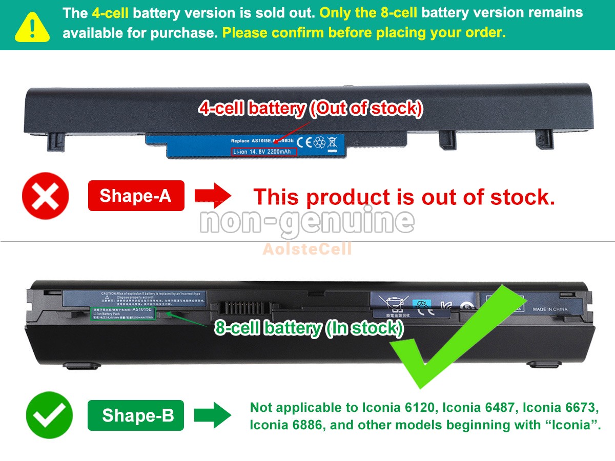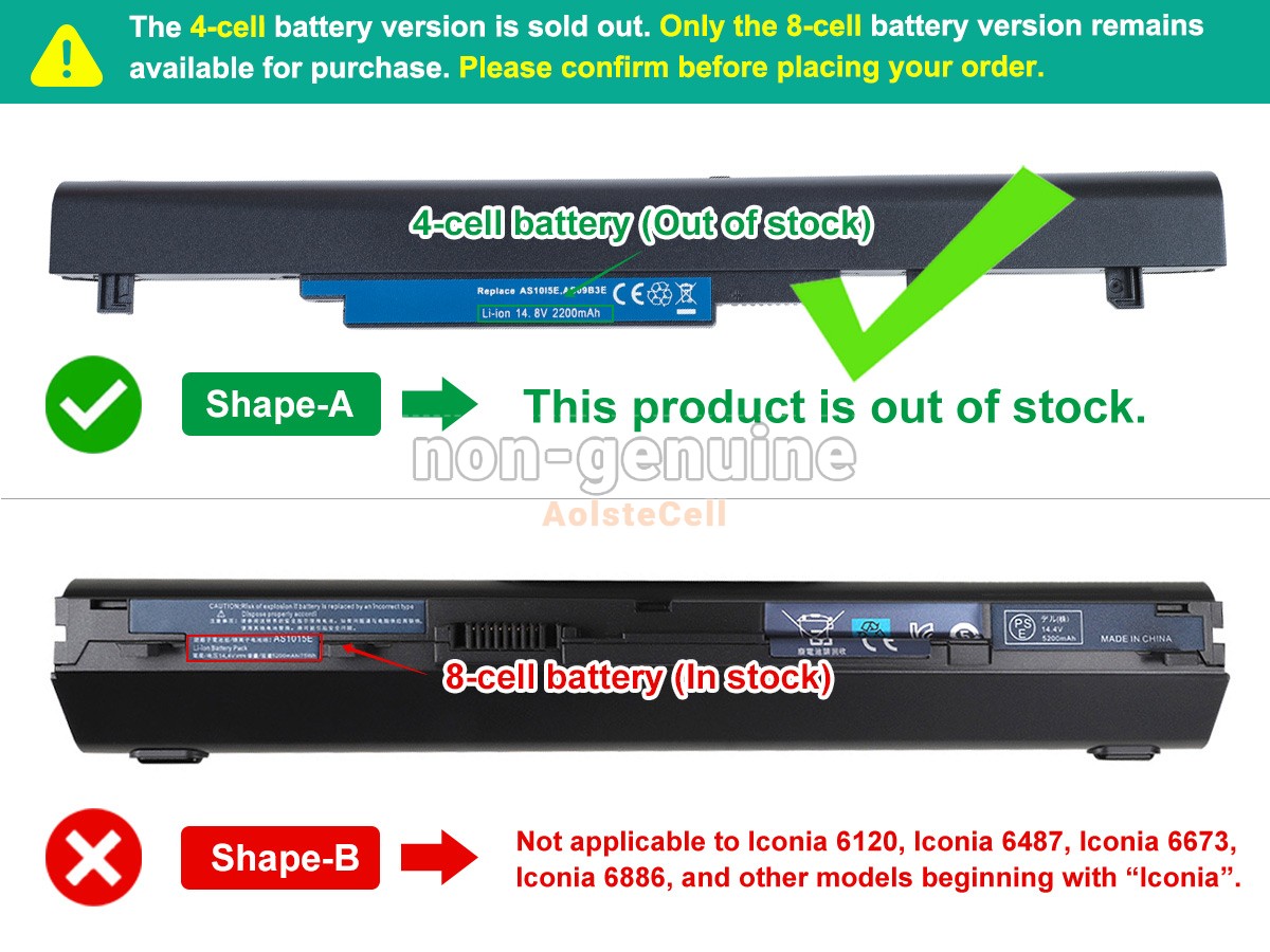 Note : 1. 14.4V and 14.8V are compatible, they are in common use. 2. The 4400mAh(8 Cells) battery will extend out about 1 inch from the bottom of the laptop, bigger size but lasting longer. And the 8 cells battery not fit for Acer Iconia 6120,Iconia 6487,Iconia 6673,Iconia 6886.