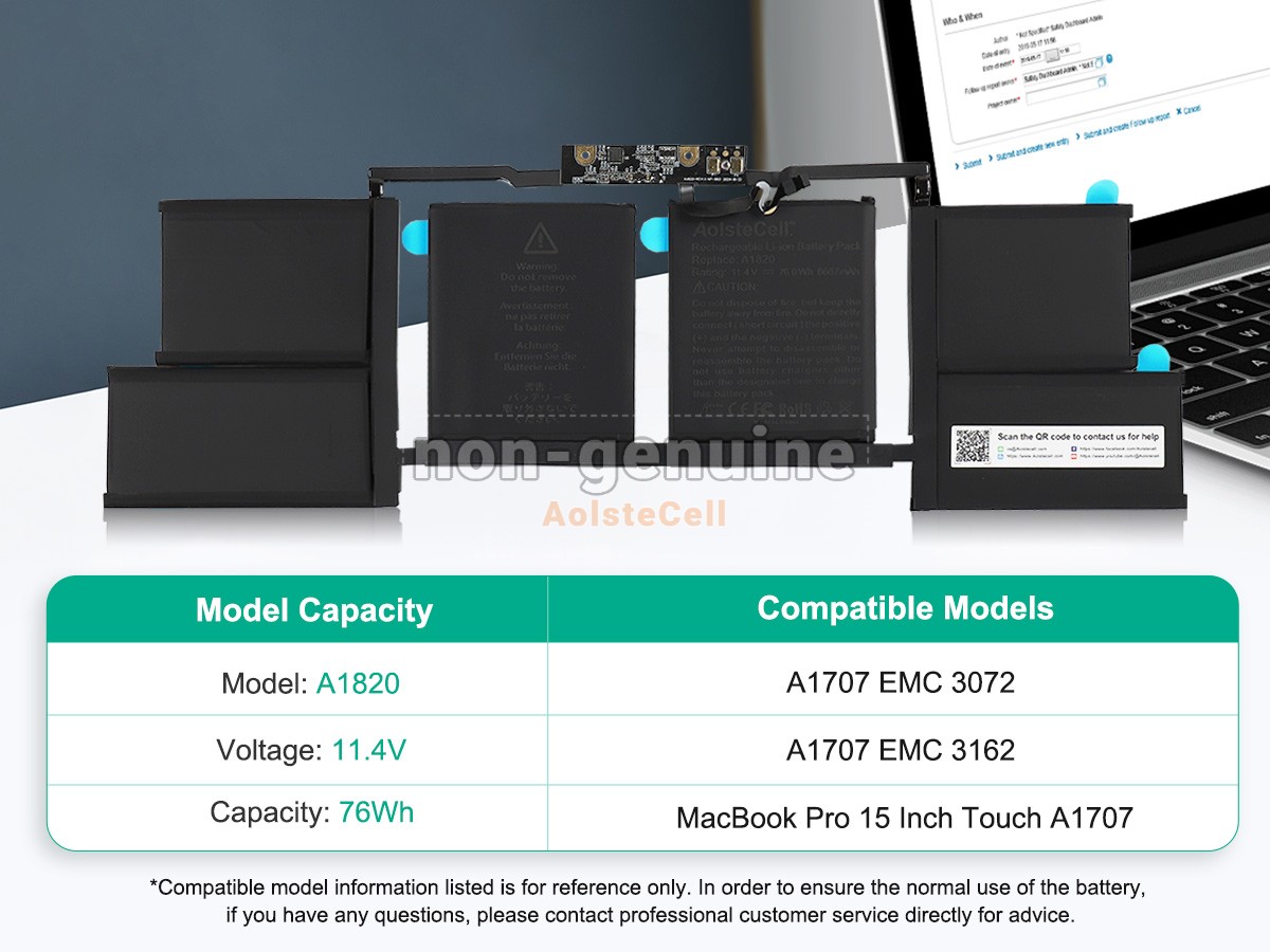 Note :1. 11.1V and 11.40V are compatible, they are in common use. 2. This battery(A1820) only compatibility with Apple MacBook Pro 15.4 Inch Touch A1707(EMC 3072)(Late 2016) and A1707(EMC 3162)(Mid 2017). 3. Package Includes: 1 x Battery ,2 x Screwdrivers.