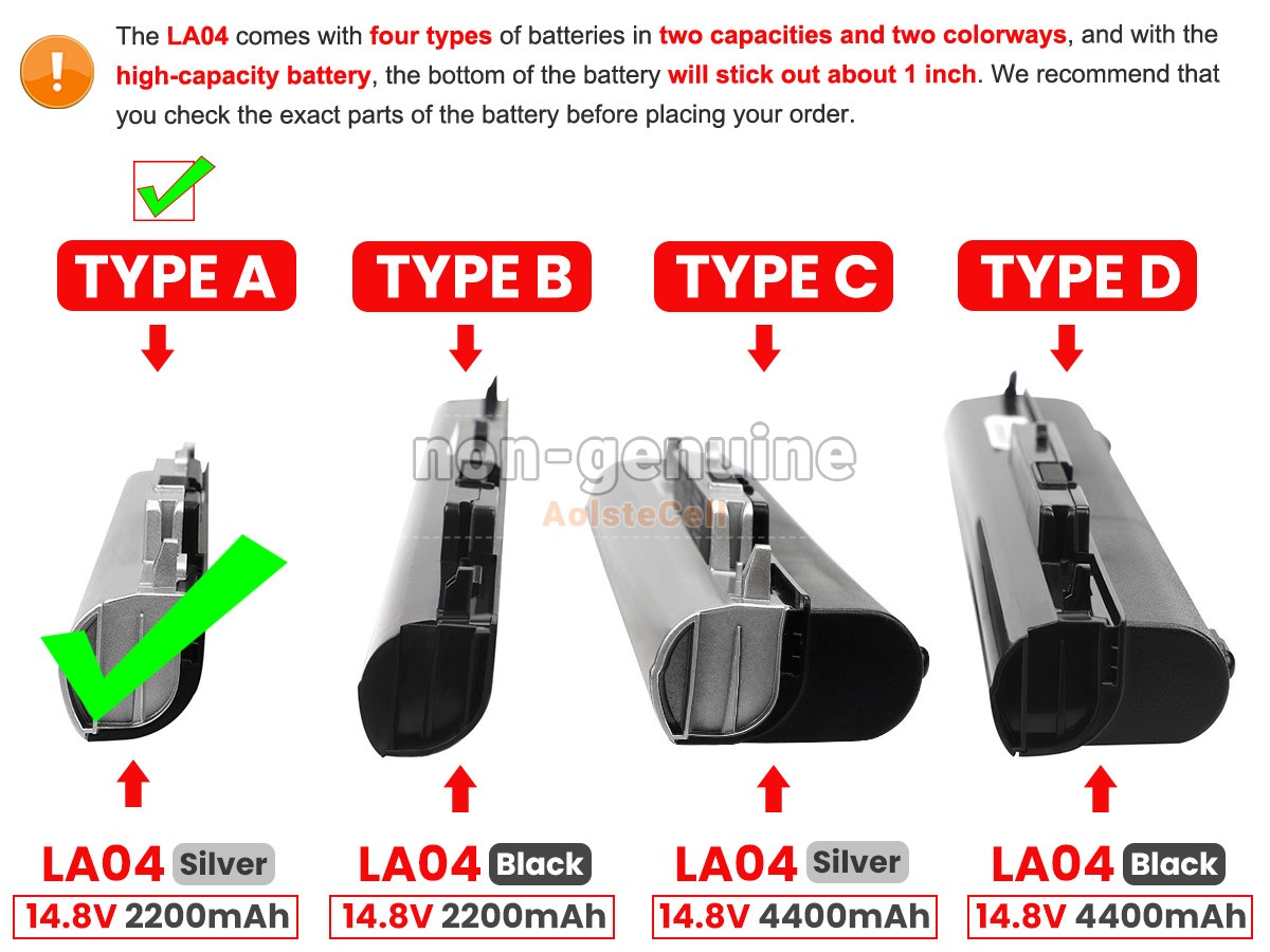Note : 1. 14.4V and 14.8V are compatible, they are in common use. 2. Please ensure your old battery model is "HP LA04",not "HP OA04", since "HP LA04" and "HP OA04" batteries are very similar, but not the same battery.3. The 4400mAh(8 Cells) battery will extend out about 1 inch from the bottom of the laptop, bigger size but lasting longer.